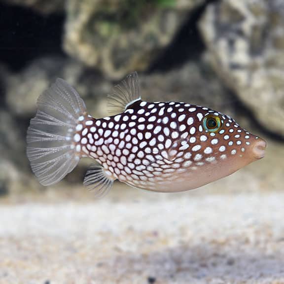 The Hawaiian White Spotted Toby often pair up and display a high territorial instinct, with males typically larger than females. The male’s territory usually includes one to four females, whom he partners with at different times. However, the females stick to their male partner. These fish also fiercely defend their territory against other species, often leaving a signature cookie-cutter shaped bite.